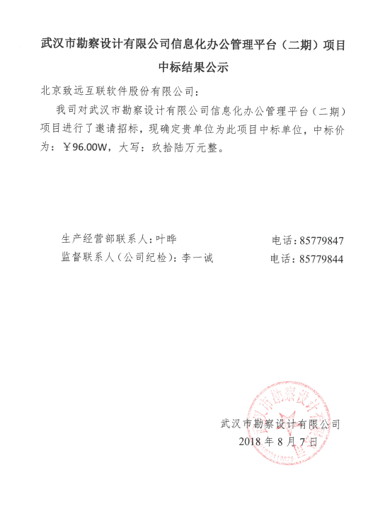 武漢市勘察設(shè)計(jì)有限公司信息化辦公管理平臺(tái)(二期)項(xiàng)目中標(biāo)結(jié)果公示